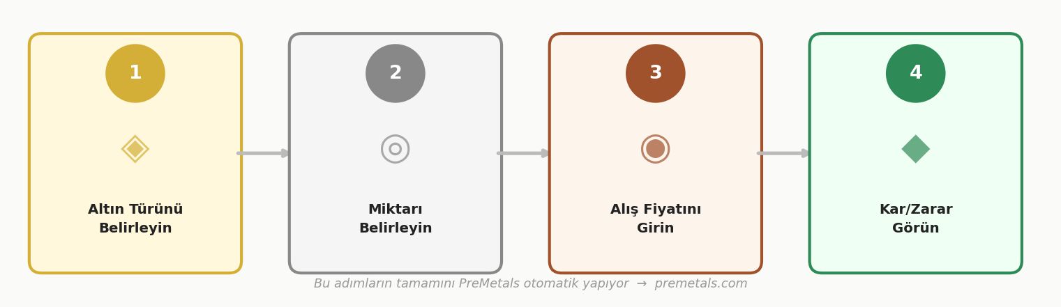 Evinizdeki altının güncel piyasa değerini ve ne kadar kar veya zarar ettiğinizi nasıl hesaplayacağınızı adım adım öğrenin. PreMetals ile bu hesabı saniyeler içinde otomatik yapın.