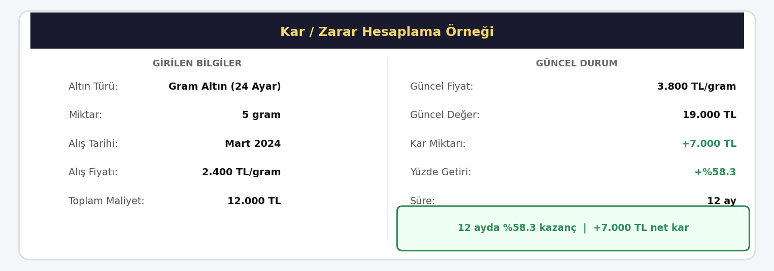 Toplam Değer = Altın Miktarı (gram) × Güncel Gram Fiyatı (TL)